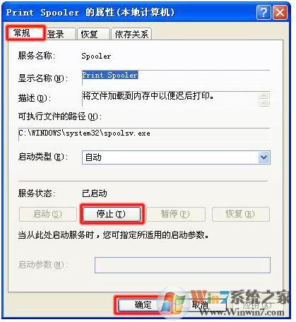 4、在“Print Spooler 的屬性(本地計(jì)算機(jī))”窗口中,選擇“常規(guī)”選項(xiàng)卡,點(diǎn)擊“停止”按鈕,然后點(diǎn)擊“確定”按鈕。如圖停止服務(wù)所示: