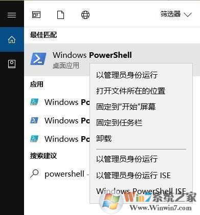 2. 管理員身份打開(kāi)PowerShell,如果你找不到它在哪里,在Cortana里面輸入PowerShell可以顯示并且右鍵管理員身份。復(fù)制粘貼