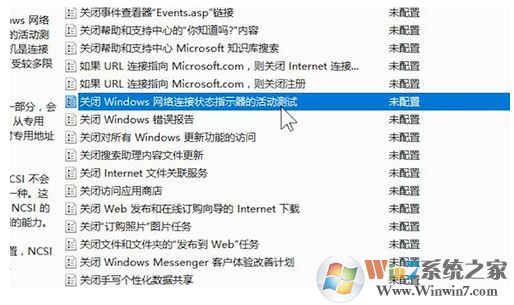 然后我們單機(jī)“Internet通信設(shè)置”,之后雙擊“關(guān)閉Windows網(wǎng)絡(luò)連接狀態(tài)指示器活動(dòng)測(cè)試”,勾選“已啟用”后點(diǎn)擊“確定”就可以了