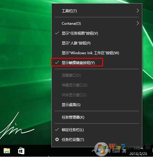 3、Win10還有一種鍵盤可以適合觸屏操作,右鍵點擊任務欄,然后選擇“顯示觸摸鍵盤按鈕”;