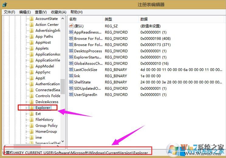 3、進(jìn)入注冊表編輯器之后點(diǎn)擊左側(cè)欄依次展開HKEY_CURRENT_USER\Software\Microsoft\Windows\CurrentVersion\Explorer。