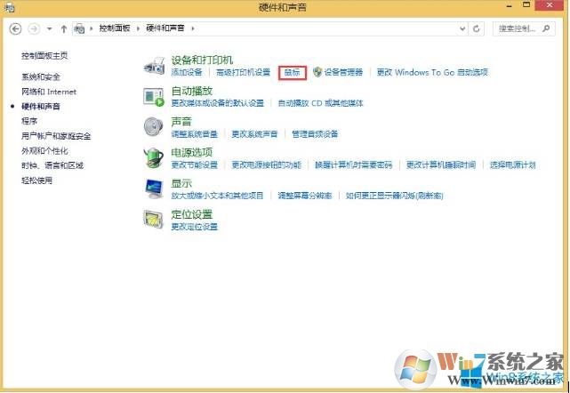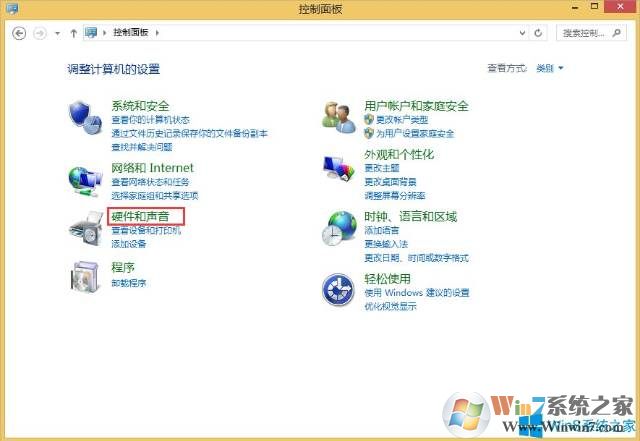 1、按下WIN+X,然后選擇控制面板,打開【控制面板】,找到【硬件和聲音】。