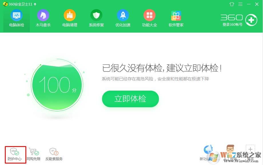2、打開360安全衛(wèi)士,點擊“防護中心”;