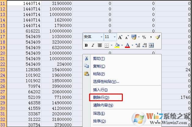 4、然后全選,把這些滿足篩選條件的行都刪除即可。