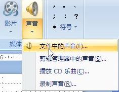 打開“插入”->“聲音”->“文件中的聲音”,插入準(zhǔn)備好的聲音文件(MP3或WAV等等,假設(shè)現(xiàn)在插入了“詞不達(dá)意.mp3”);