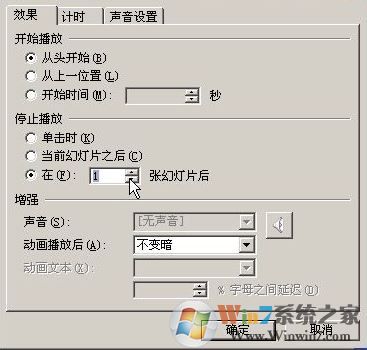 在“效果選項”設(shè)置頁面,“停止播放”的默認(rèn)選項是 [單擊時] ,根據(jù)你的需要,想讓背景音樂在“X”張幻燈片內(nèi)存在,就在“停止播放”選項中選擇“在X 張幻燈片后”,其中 X 代表你想要背景音樂持續(xù)存在的幻燈片數(shù)量。