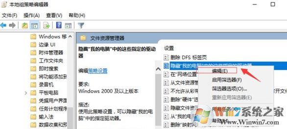 3、在本地計算機策略,用戶配置,管理模板,Windows組件,Windows資源管理器,找到“隱藏我的電腦中的這些指定的驅(qū)動器”;