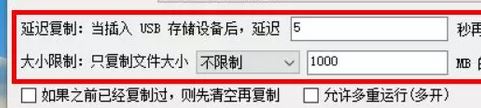 5、設(shè)置延遲復制時間,即U盤插入電腦后多久開始自動復制文件。“大小限制”,可以設(shè)置復制文件的大小范圍,如圖: