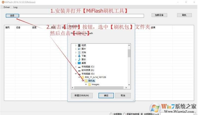 2、下載miflash刷機(jī)工具,打開(kāi),選擇刷機(jī)包,然后確定;
