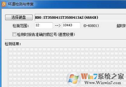 5、點擊左上角“選擇硬盤”按鈕,選擇你要檢測的盤符(整個硬盤),設(shè)定檢測范圍(柱面范圍默認即可),點擊“開始檢測”按鈕,如圖: