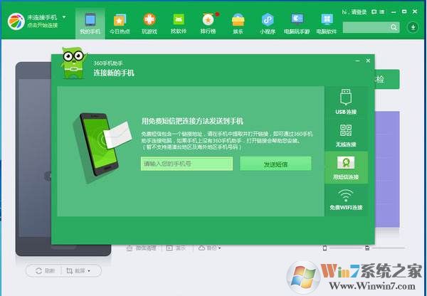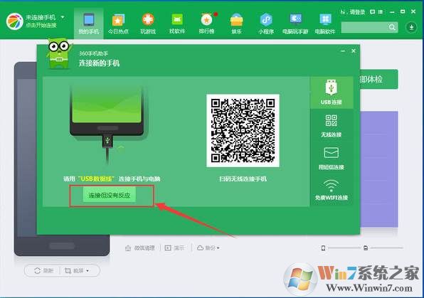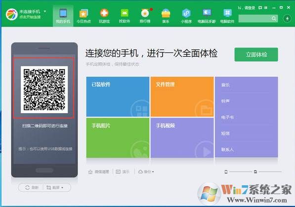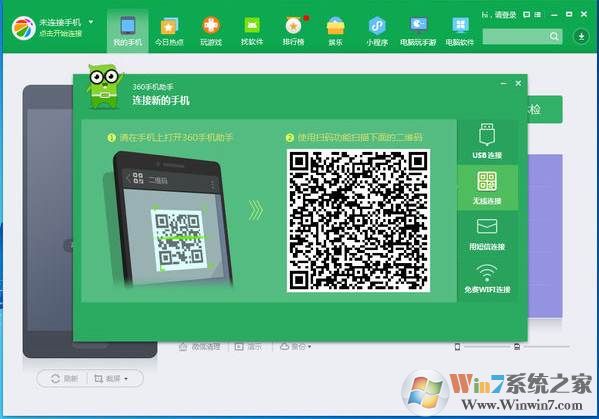 4、同時我們也可以使用手機(jī)里的360手機(jī)助手掃描電腦端的二維碼來進(jìn)行連接;