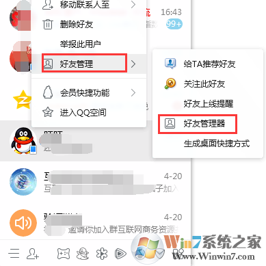1、打開QQ好友面板,然后右鍵點擊一個好右,選擇“好友管理”——“好友管理器”;如下圖