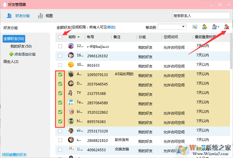 2、好了,這時我們勾選你要刪除的好友。如果要全選擇話,勾選箭頭所指的復選框,然后點擊箭頭所指的刪除按鈕;