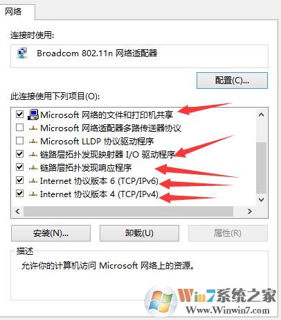 4、在更改適配器設(shè)置--網(wǎng)絡(luò)連接--wifi屬性中,僅僅勾選以下四個(gè)的內(nèi)容。我的是因?yàn)楣催x了360局域網(wǎng)防護(hù)驅(qū)動(dòng)程序和Q0s數(shù)據(jù)包計(jì)劃程序,如圖所示: