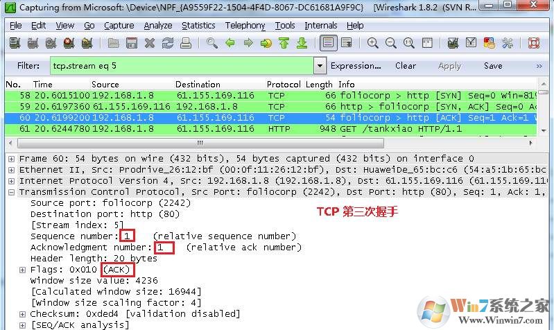 圖中可以看到wireshark截獲到了三次握手的三個(gè)數(shù)據(jù)包。第四個(gè)包才是HTTP的, 這說(shuō)明HTTP的確是使用TCP建立連接的。