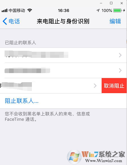 6、找到號碼點住 ——左邊滑動,取消阻止,即可(或,點擊編輯,再點減號 就可以了?。?br />