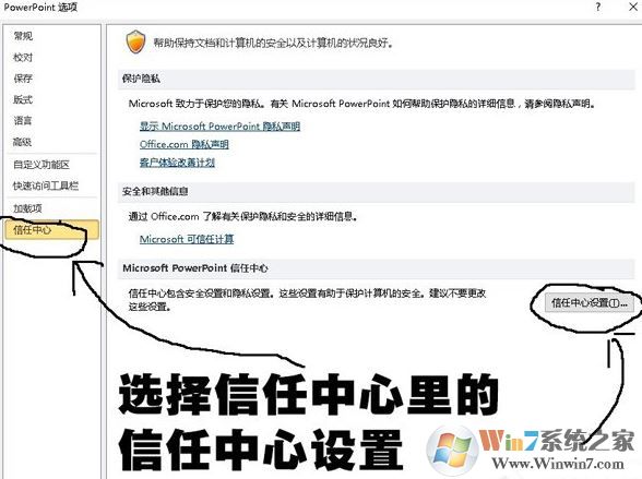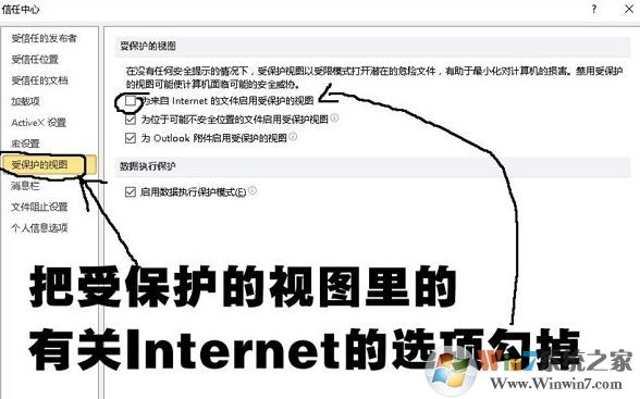 3、打開信任中心設置界面后把受保護的視圖里的有關Internet的選項勾掉,點擊確定之后關閉目前文檔重新打開即可,如下圖所示: