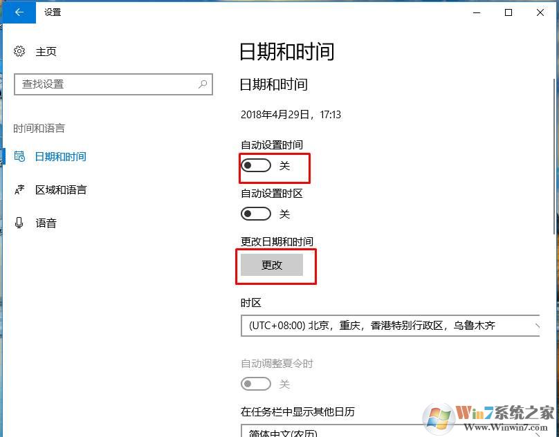 3、開始大家可能會(huì)發(fā)現(xiàn),更改按鈕是灰色不能點(diǎn)擊的,沒問題,我們可以先把上面的 自動(dòng)設(shè)置時(shí)間,關(guān)閉,這時(shí)就可以看到下面的更改按鈕了。
