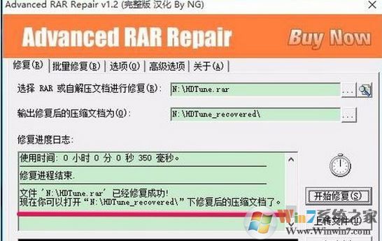 5、修復(fù)完成,彈出信息對話框:文件 'N:\HDTune.rar' 已經(jīng)修復(fù)成功 ! 現(xiàn)在你可以打開“N:\HDTune_recovered\”下修復(fù)后的壓縮文檔了。我們點擊:確定即可。
