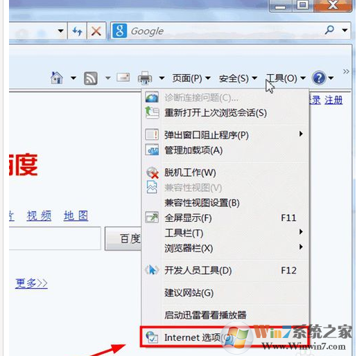 1、首先,打開IE瀏覽器然后在IE頁面的右上角點擊“工具”按鈕,彈出下拉菜單,選擇“internet選項”