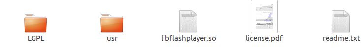 4、提取后得到兩個目錄usr、LGPL和三個文件libflashplayer.so、license.pdf、readme.txt,如圖所示: