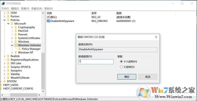 Win10關(guān)閉Windows Defender方法二:注冊(cè)表