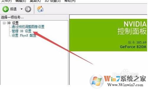 2、這時(shí)會(huì)打開NviDIA控制面板窗口,點(diǎn)擊左側(cè)邊欄的“管理3D設(shè)置”菜單項(xiàng)