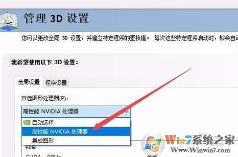 3、在右側(cè)窗口中找到“首先圖形處理器”設(shè)置項(xiàng),點(diǎn)擊其下拉菜單,在彈出菜單中選擇“高性能NVIDIA處理器”菜單項(xiàng)。最后點(diǎn)擊保存按鈕,這樣Windows10系統(tǒng)就會(huì)使用獨(dú)立顯卡而不再使用集成顯卡了。