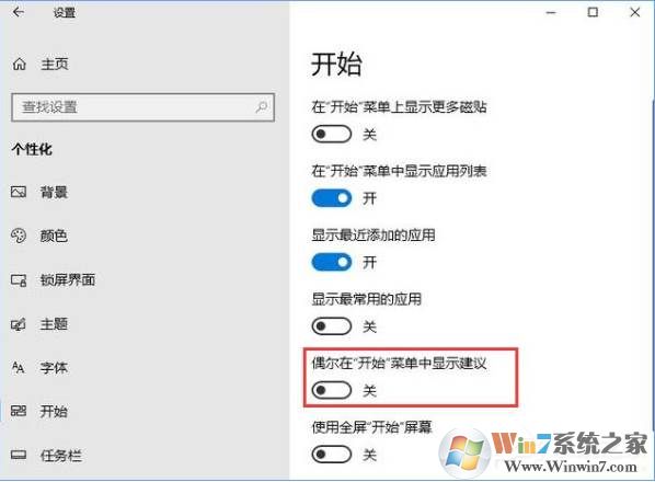 3、在設置——個性化——開始中關閉 【偶爾在開始菜單中提示建議】winwin7.com