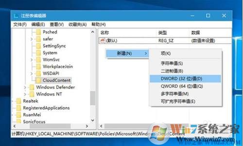 5、選中CloudContent項,在右側(cè)新建名為DisableWindowsConsumerFeatures的DWORD(32位)值,如下圖所示: