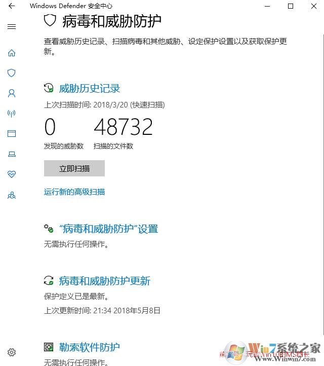 1、《Windows Defender安全中心》的“病毒和威脅防護(hù)”設(shè)置界面的底部有一個(gè)專(zhuān)門(mén)的“勒索軟件防護(hù)”設(shè)置項(xiàng)。如圖: