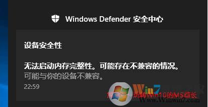 開(kāi)啟后會(huì)提示你重啟設(shè)備。并且不是所有的設(shè)備都能開(kāi)啟,你可能會(huì)看到“無(wú)法啟動(dòng)內(nèi)存完整性??赡艽嬖诓患嫒莸那闆r”的通知消息。如圖: