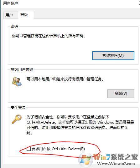 5、切換到 高級 選項,在下面我們可以看到“要求用戶按 Ctrl+Alt+Delete” 的選項去掉,點擊確定 保存設(shè)置即可!