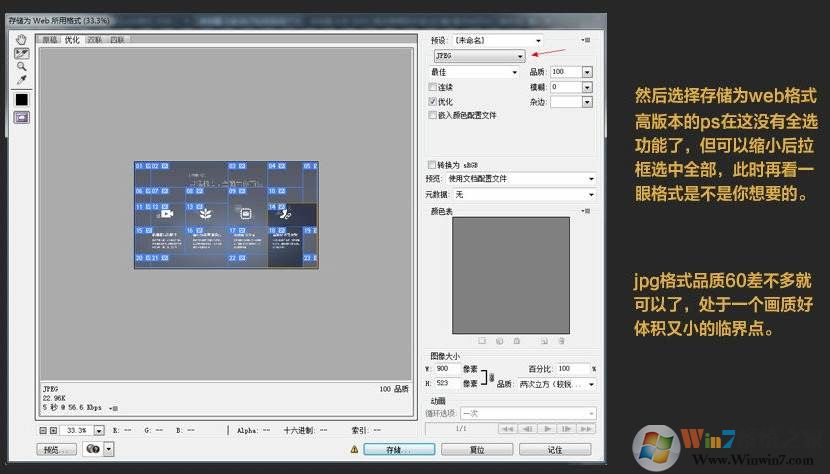 7、最后然后選擇存儲(chǔ)為WEB格式,高版本的ps在這沒有全選功能了,但可以縮小后拉框選中全部,此時(shí)再看一眼格式是不是你想要的,jpg格式品質(zhì)60差不多就可以了,牌一個(gè)畫質(zhì)好,體積又小的臨界點(diǎn)