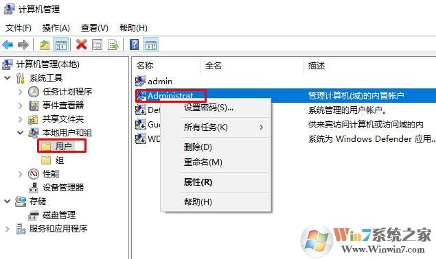 2、打開計(jì)算機(jī)管理之后,展開 本地用戶和組——用戶,然后右鍵點(diǎn)擊Administrator帳戶選擇屬性;Winwin7.com
