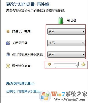 1、點擊任務(wù)欄右下角電池圖標(biāo)——“更多電源選項“;進(jìn)入 “電源選項”界面后,選擇“高性能”電源計劃,單擊右邊的“更改計劃設(shè)置”,將“使用電池”下的所有選項設(shè)為“從不”,然后將電腦屏幕亮度設(shè)為最大值。m.cncxm.com