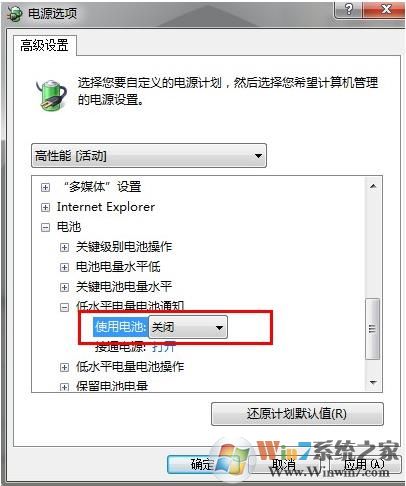 3、展開“電池→低水平電池電量通知”,將“使用電池”設(shè)為“關(guān)閉”(如圖),