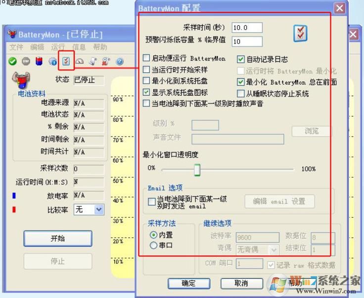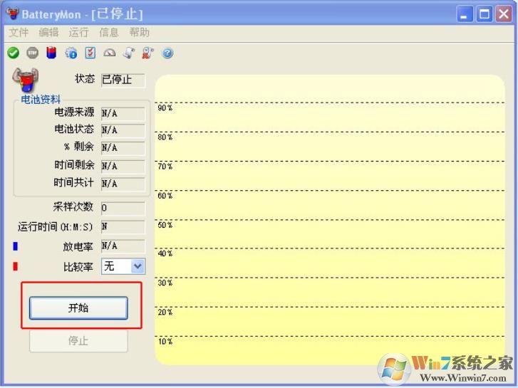 3、同樣的,按照前面所講解的方法一或方法二的設(shè)置說明,將筆記本的電源管理設(shè)置完成,之后拔掉外接電源,只使用電池操作剩余的工作。直接點擊”開始“按鈕,筆記本電池放電