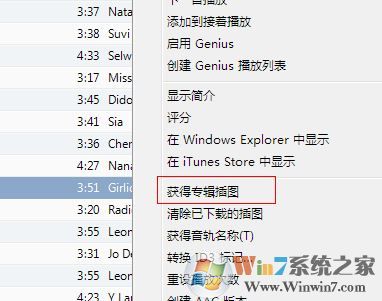 3、選中某首歌,右鍵出現(xiàn)如下所示,點擊“獲取專輯圖片”就能得到專輯圖片,如圖: