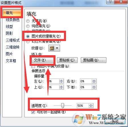 3、勾選“填充”里的“圖片或紋理填充”,再將透明度的滑塊調(diào)到50%,再點(diǎn)擊“文件”;