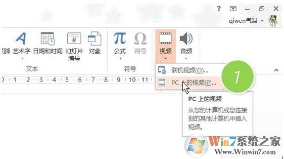 2、點(diǎn)擊工具欄上的插入,然后找到 插入(影片或是視頻,版本不同)并插入一個(gè)視頻。(如下圖1處)