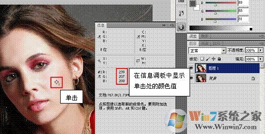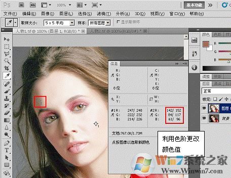 (6)完畢后單擊“確定”按鈕關(guān)閉對(duì)話框,觀察“信息”調(diào)板,在“人物 2”中的吸取的顏色替換了“人物 1”中的顏色值。