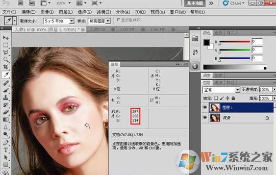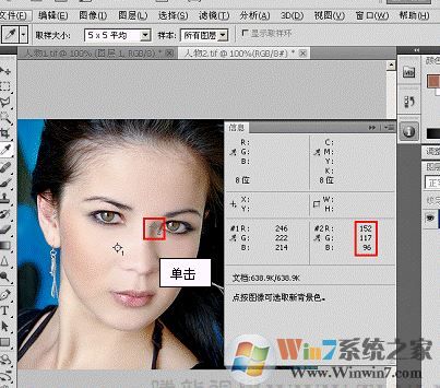 (4)再激活“人物 1.tif”文件,配合按下鍵,在“人物 1”的面部亮部區(qū)域單擊,再次設(shè)置取樣點(diǎn)。