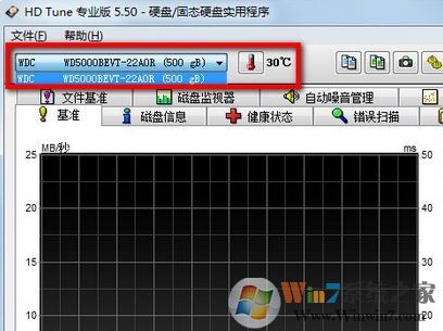 1、HDTune使用方法很簡(jiǎn)單,打開HDTune硬盤檢測(cè)工具后我們可以選擇硬盤,在主界面就可以看到硬盤的溫度,如圖: