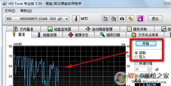 2、在HDTune硬盤檢測(cè)工具右側(cè)選擇讀取或者寫入,然后點(diǎn)擊開始可以測(cè)試硬盤的讀取和寫入速度,如圖: