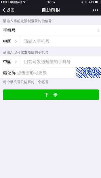 (7)輸入被封微信賬號——輸入驗證手機(jī)號碼——輸入驗證碼