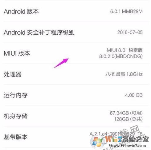 3.之后,我們在打開的頁面中能夠看到一些關(guān)于手機的信息,我們需要在里面找到一個MIUI版本的地方,在上面連續(xù)點擊5次以上。(下圖箭頭指向處)