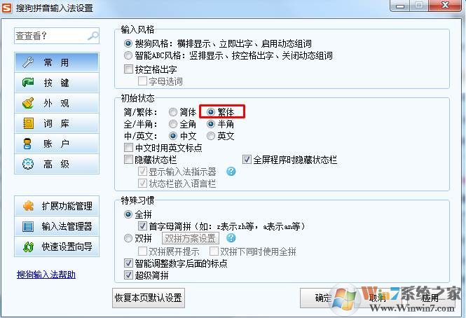 2、打開設置之后,再點擊初始狀態(tài)為繁體即可。