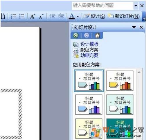 2、單擊任務(wù)窗格頂部的下拉按鈕,在隨后彈出的下拉列表中,選擇“幻燈片設(shè)計(jì)——配色方案”選項(xiàng),展開“幻燈片設(shè)計(jì)——配色方案”任務(wù)窗格。