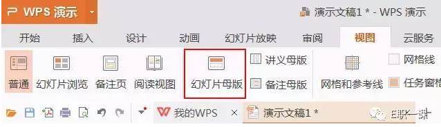①點(diǎn)擊【視圖】,選擇模板視圖選項(xiàng)卡里面的【幻燈片母版】